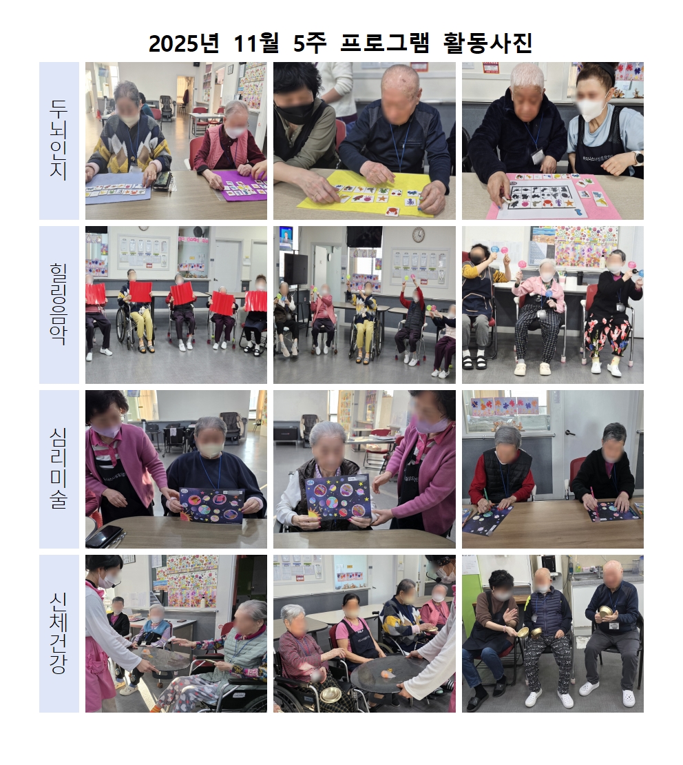 힐링음악(여가) 시간에는 ‘달타령’ 수업을 진행하였습니다. 민요 ‘달타령’을 배경으로 도구를 활용한 음악 체조를 진행하며 신체 움직임의 범위를 자연스럽게 넓혀보는 시간을 가졌습니다. 노래 속 월별 숫자를 활용하여 음악을 통한 자연스러운 숫자 인지 활동도 함께 이루어졌습니다. 또한 클랩타를 접고 펴는 반복 동작을 통해 방향 감각, 손가락 운동, 관절 운동을 활성화하며 건강 유지에 도움이 되었습니다.